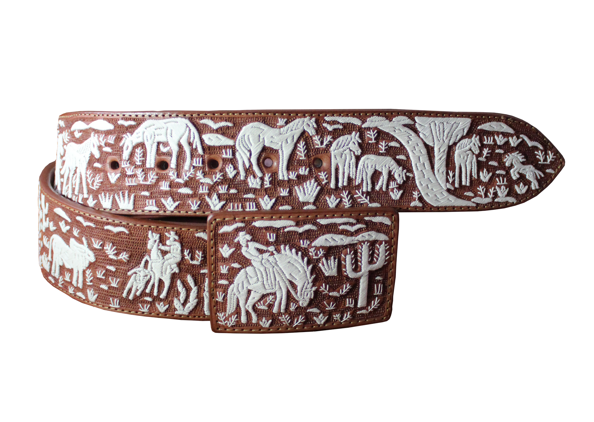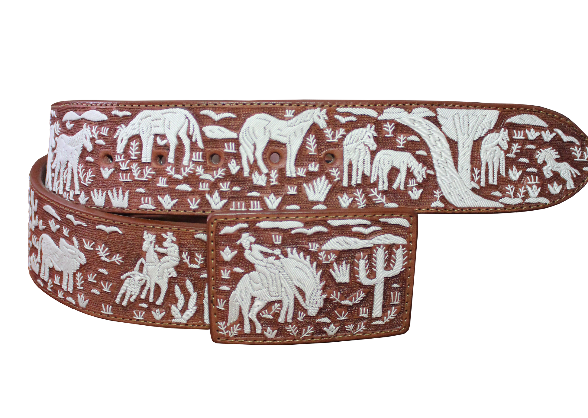 Forjado artesanalmente con vaqueta de res de primera calidad, este cinto luce una pita bordada a mano que retrata la fuerza y destreza del rodeo: jinetes dominando la montura, polvo levantándose en la arena y el espíritu indomable del campo. Su tono canela resalta el carácter auténtico y recio del hombre vaquero, evocando orgullo, valentía y pasión por la vida a caballo.